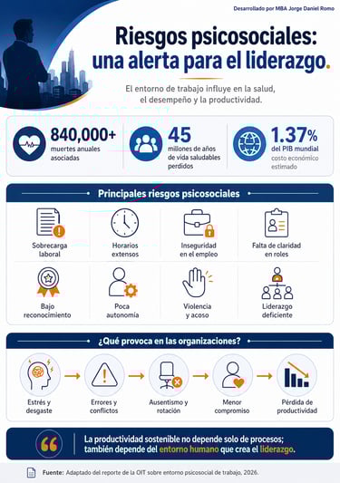 Los riesgos psicosociales no son un tema menor. Incluyen factores como sobrecarga laboral, horarios extensos, inseguridad en el empleo, falta de claridad en los roles, bajo reconocimiento, violencia, acoso, poca autonomía y estilos de liderazgo deficientes. De acuerdo con la OIT, estos riesgos están asociados con más de 840,000 muertes anuales y una pérdida estimada equivalente al 1.37% del PIB mundial.