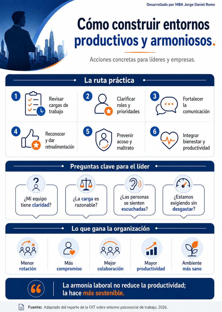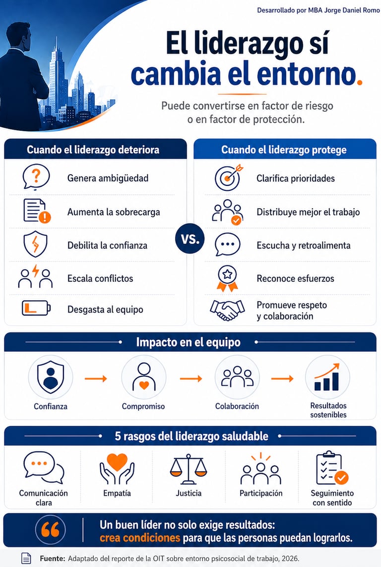 La OIT destaca que los entornos saludables se fortalecen con justicia, confianza, apoyo, autonomía, participación y liderazgo abierto. En la práctica, esto significa que el líder puede ser un factor de protección o un factor de riesgo.